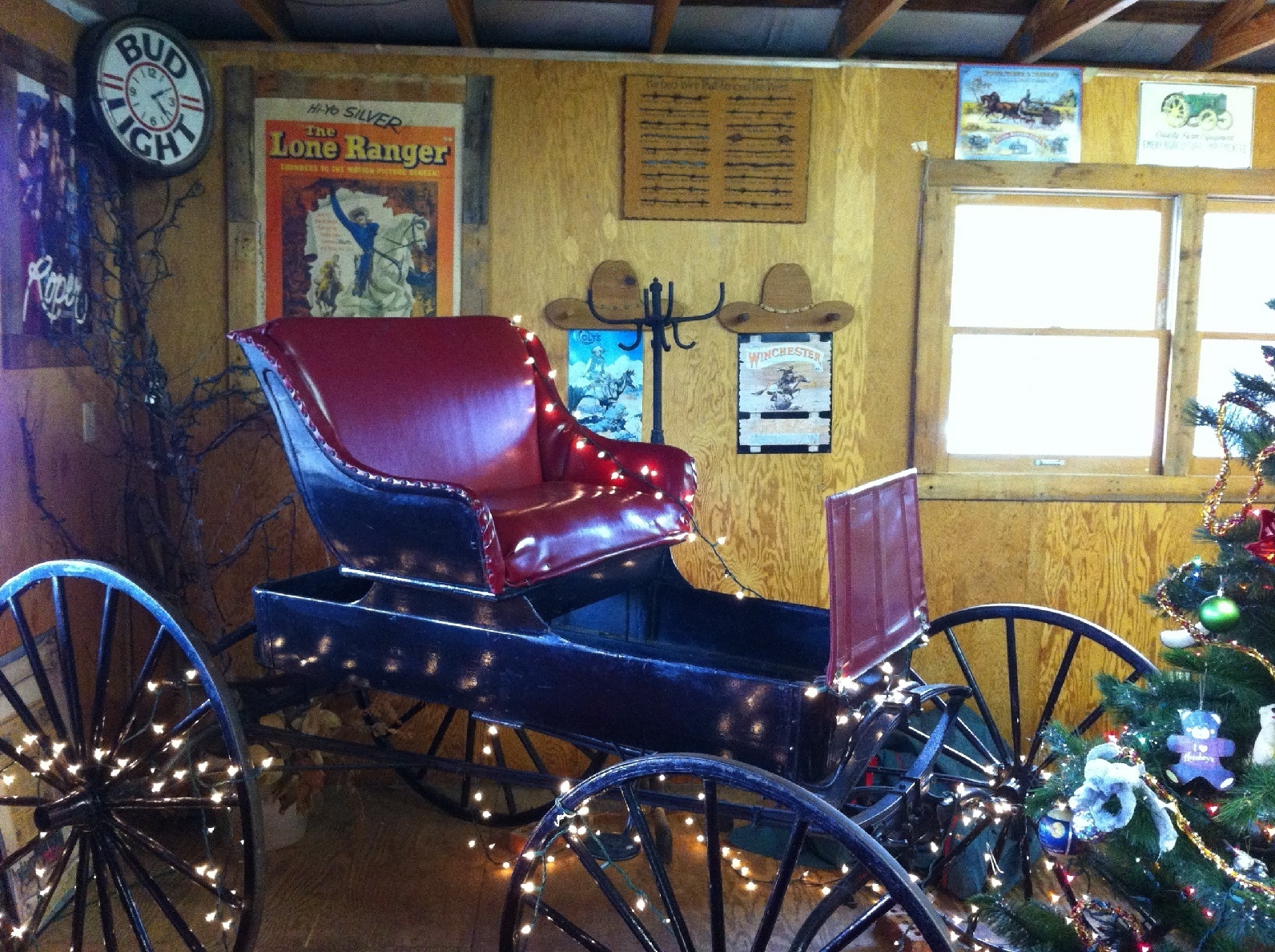 The little buckboard above that’s all gussied up for Christmas sat in a corner of the dance hall. I loved it and the Wild West paraphernalia around it. Click on the image to enlarge, and be sure to check out the Lone Ranger movie poster on the wall. I figured I had to share it with you.