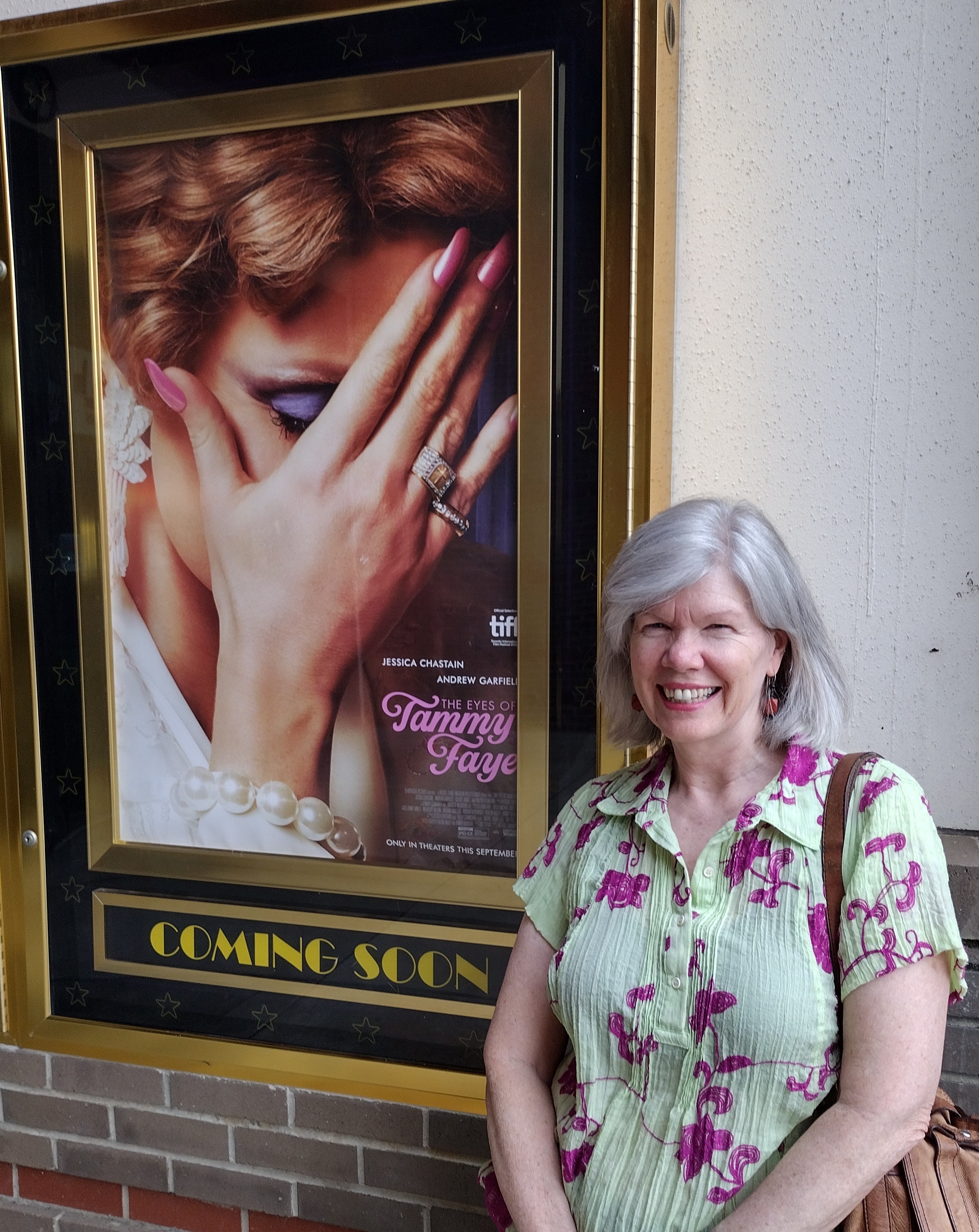 My wife Julie had a speaking role in The Eyes of Tammy Faye, a new movie based on the story of Jim and Tammy Bakker. We caught the premiere last night in Charlotte. Here, Julie is posing outside the theater. (The picture above, by the way, was made by Ken Garfield, the former religion editor of the Charlotte Observer.)
