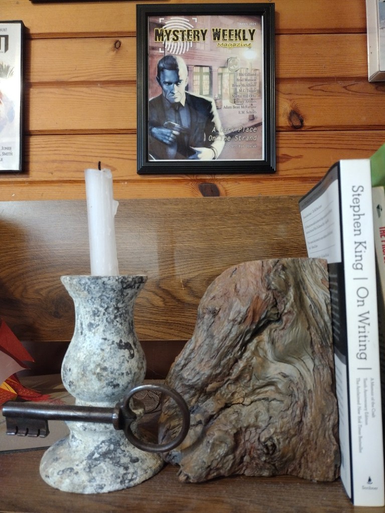 And here’s the shelf above my laptop. It’s easy to imagine various expressions in the contorted driftwood bookend. Depending on the slant of light, you can discover all sorts of shapes shifting around on the patina of the battered candlestick. On that candlestick is the key to an old German pie safe my wife bought. A few months ago, gazing at that key sparked the idea that it opened the door to a haunted house. Who would want that key? That little germ of an idea blossomed into my latest sale, which I expect to be published this summer.