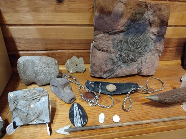 Here are some of the Native American artifacts from my collection, which includes a sandstone tobacco pipe in the shape of a frog, an ax, a (reconstructed) sling, and an arrow. The fossils add just the right amount of primeval ambience.