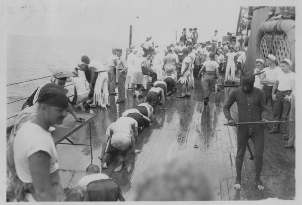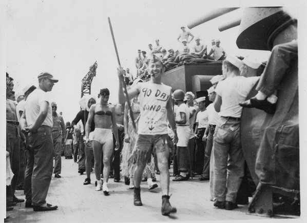 Officers were not spared. Above, a recent Midshipman School graduate (90-day wonder) marches cheerfully to his doom. Sailors who had previously been initiated – Shellbacks – look on approvingly.